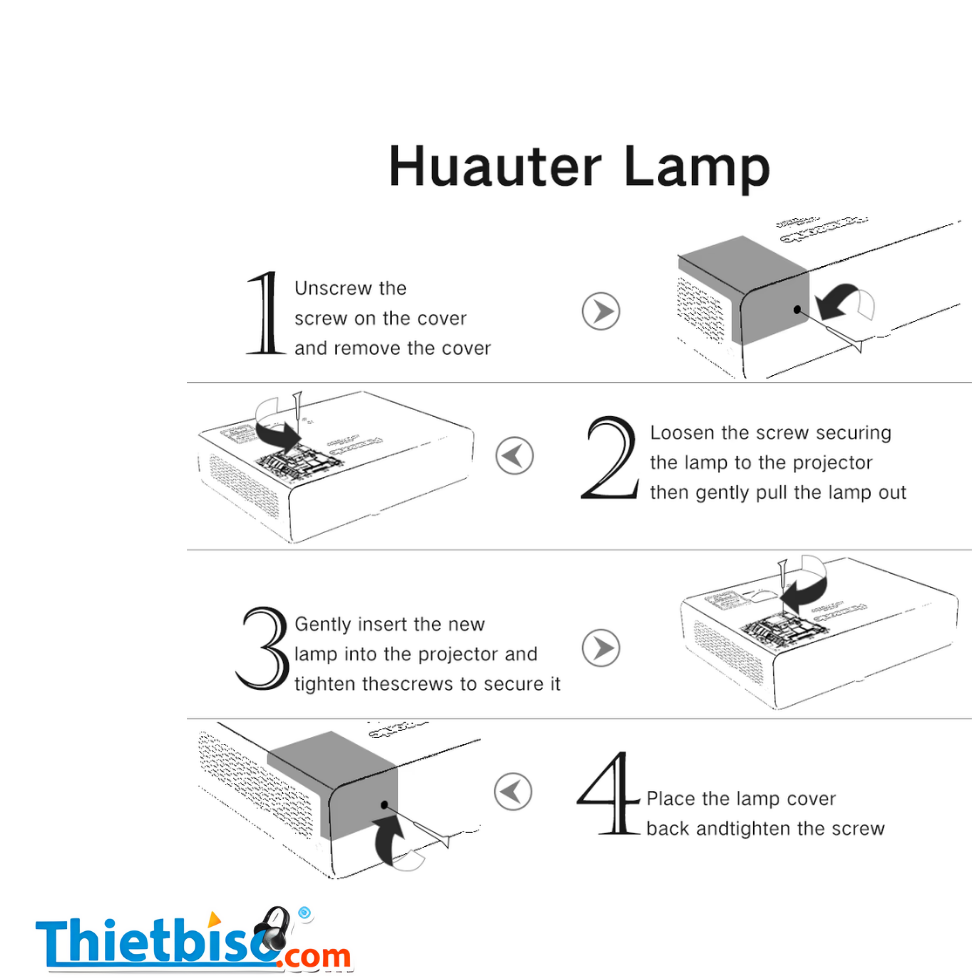 Chú ý: Khi thay bóng đèn máy chiếu phải vệ sinh bảo dưỡng toàn bộ máy chiếu như bộ quang học, lọc bụi, quạt làm mát, các rack kết nối để máy chiếu được bền và hình ảnh đạt chất lượng như mong muốn.